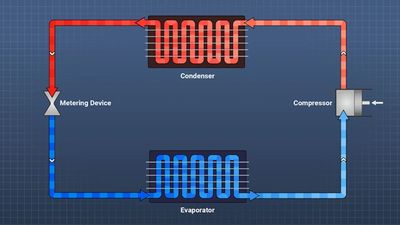 A sealed system repair is any repair pertaining to what is known as the refrigeration cycle. A refrigerant gas, usually Freon, is forced through a series a tubes and coils by a compressor. The gas is cycled through an internal evaporator coil and an external condenser coil. With the help of a metering device to restrict gas flow, the gas is forced into a high pressure condenser coil.
